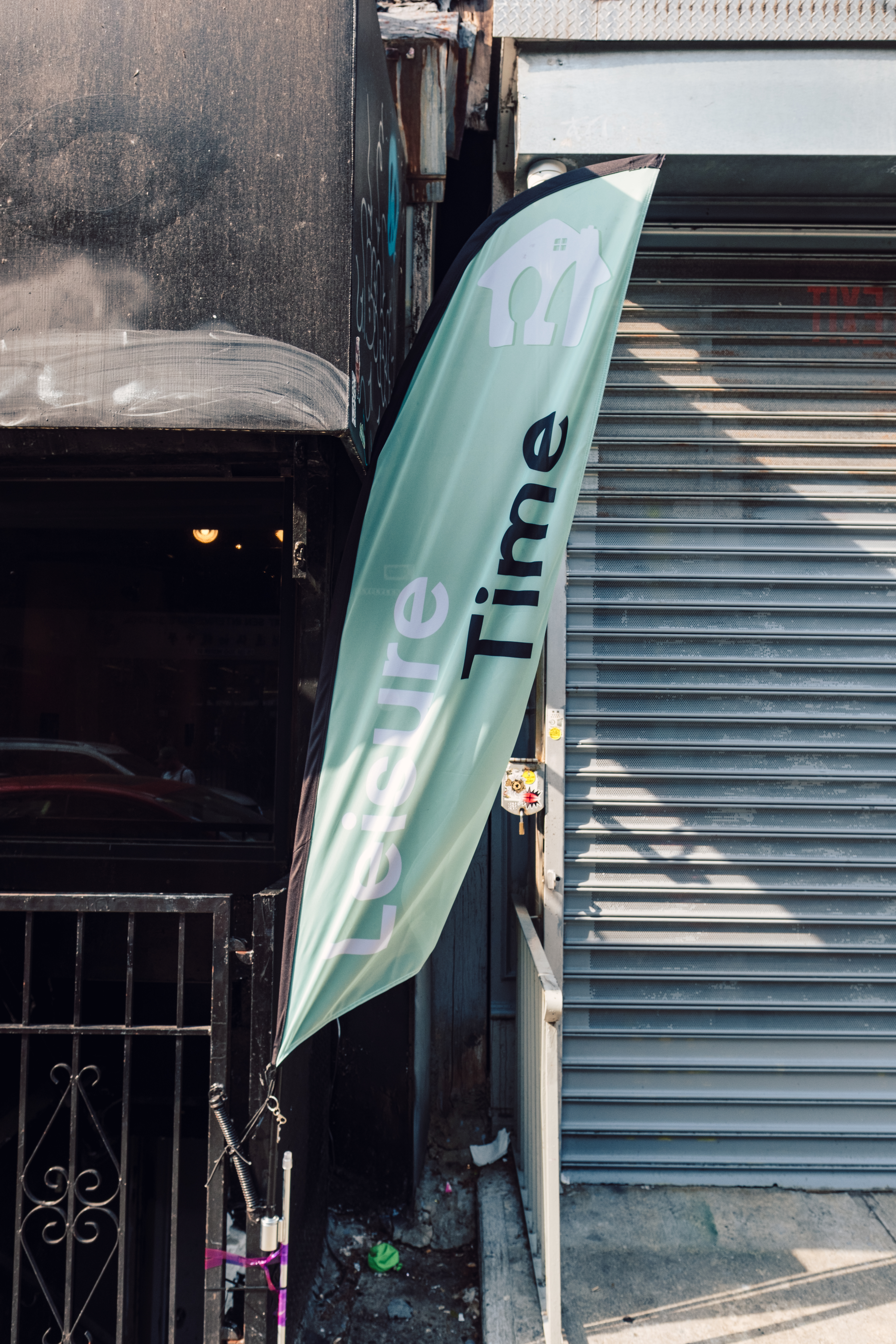 Shot largely at night, harrington’s photographs rely on an editorial style of documentation to highlight custom design motifs and utilitarian ingenuity unique to each bike. These machines, often shown resting, stand in for the workers themselves and speak to the cyborg-like expectations of the body today Outside the gallery, a feather flag regularly used in advertising features the words “Leisure Time” alongside a close-to-copyrightable graphic that undercuts the fantasy of freedom promised by gig work. Yet harrington’s critique doesn’t stop at the urban surface. His research also traces the materials that enable this labor and the labor required to use these materials: lithium-ion batteries, powered by rare earth minerals largely mined and processed in the Global South under violent and precarious conditions. With this research in hand, harrington suggests that the redistribution of time, not materials, might be the most radical act of all.