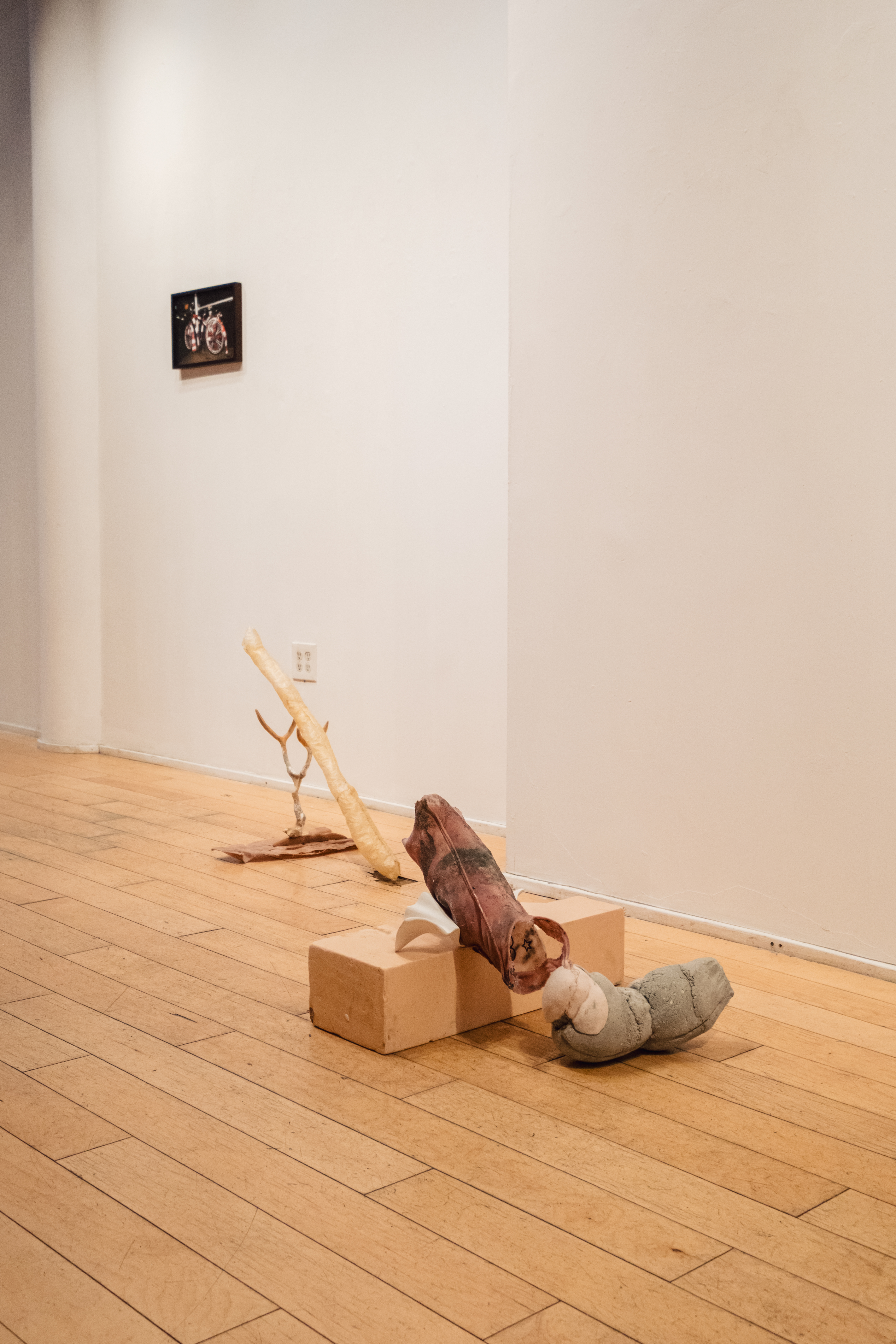 Cato Ouyang’s new sculptures are part digestive tract, part architectural ruin, and part devotional offering. The untitled works reference bodies, passageways, and sewage in response to how feminized and erotic acts of care are relegated to the bowels of society yet integral to social functioning. Made in the aftermath of their pilgrimage on the Camino de Santiago, during which Ouyang broke their foot, the works acknowledge that the cost of labor is often the body. Ouyang courts fracture, engaging enigmatic misuses of materials related to construction, industrial modeling, and traditional craft. From this multi-pronged and experimental approach to making, Ouyang’s sculptural tableaux suggest bodies disintegrating into infrastructure. Movement, restriction, and transformation loop together in a fleshy, restless circuit. The labor here is physical and emotional, a reckoning with what the body can carry, what it can remember, and what it must release.