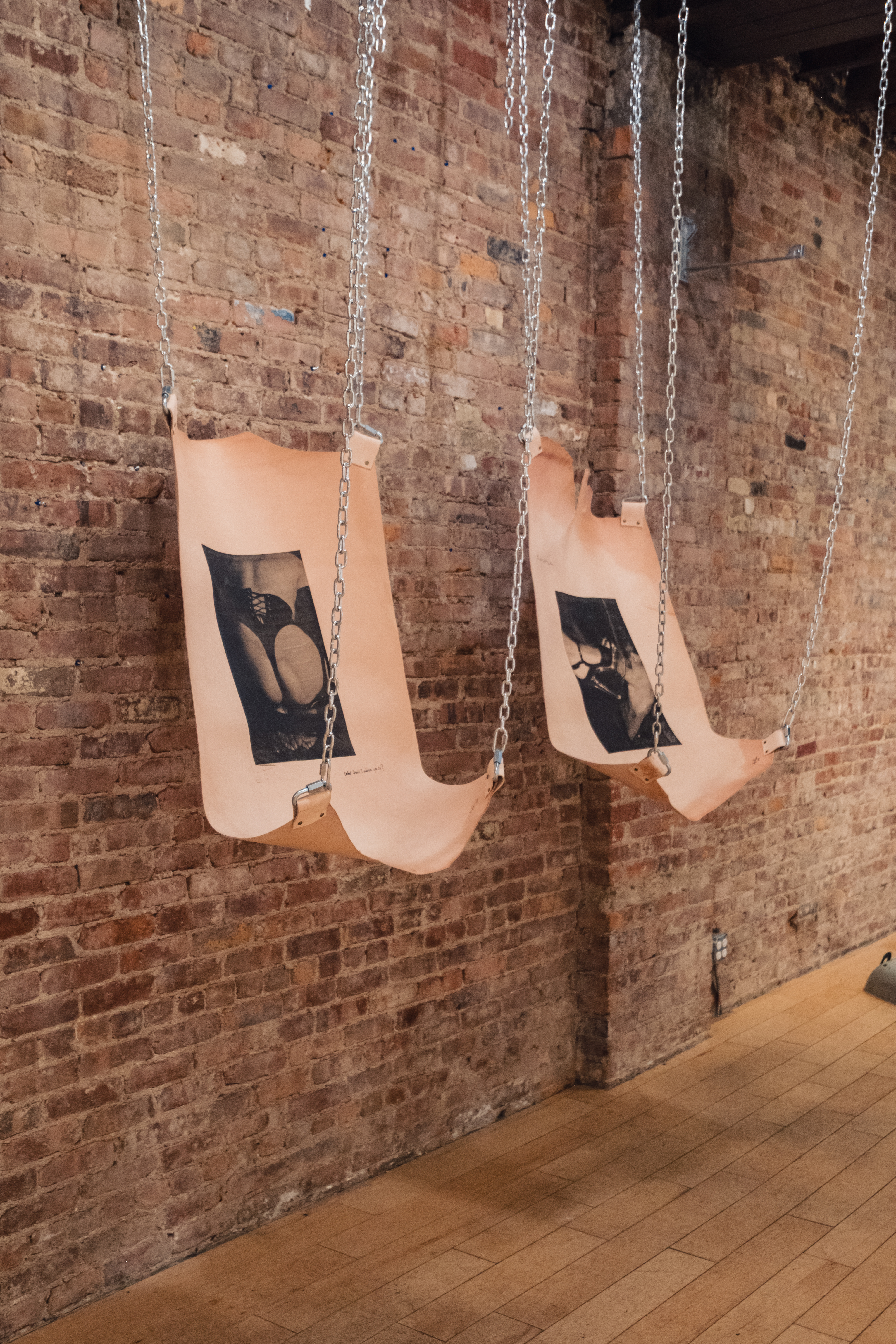 This tension draws attention to how these encounters unfold in time without demanding full understanding in order to recognize their reality. In doing so, Dozier challenges the idea that intimacy or labor must be fully “known” to be authentic, instead asserting the legitimacy of sexual labor—like sex work—as real and present within public life Just as these images teem with physicality, Dozier’s process is equally physical, even punishing. She’s developed a new technique to print on these surfaces, pushing against their resistance to simultaneously challenge material, machine,and process. Installed using fasteners and chains, these sex-swing-like installations become an extension of ongoing research and lived experience, resulting in photographic sculptures that don’t just depict erotic labor—they embody it.