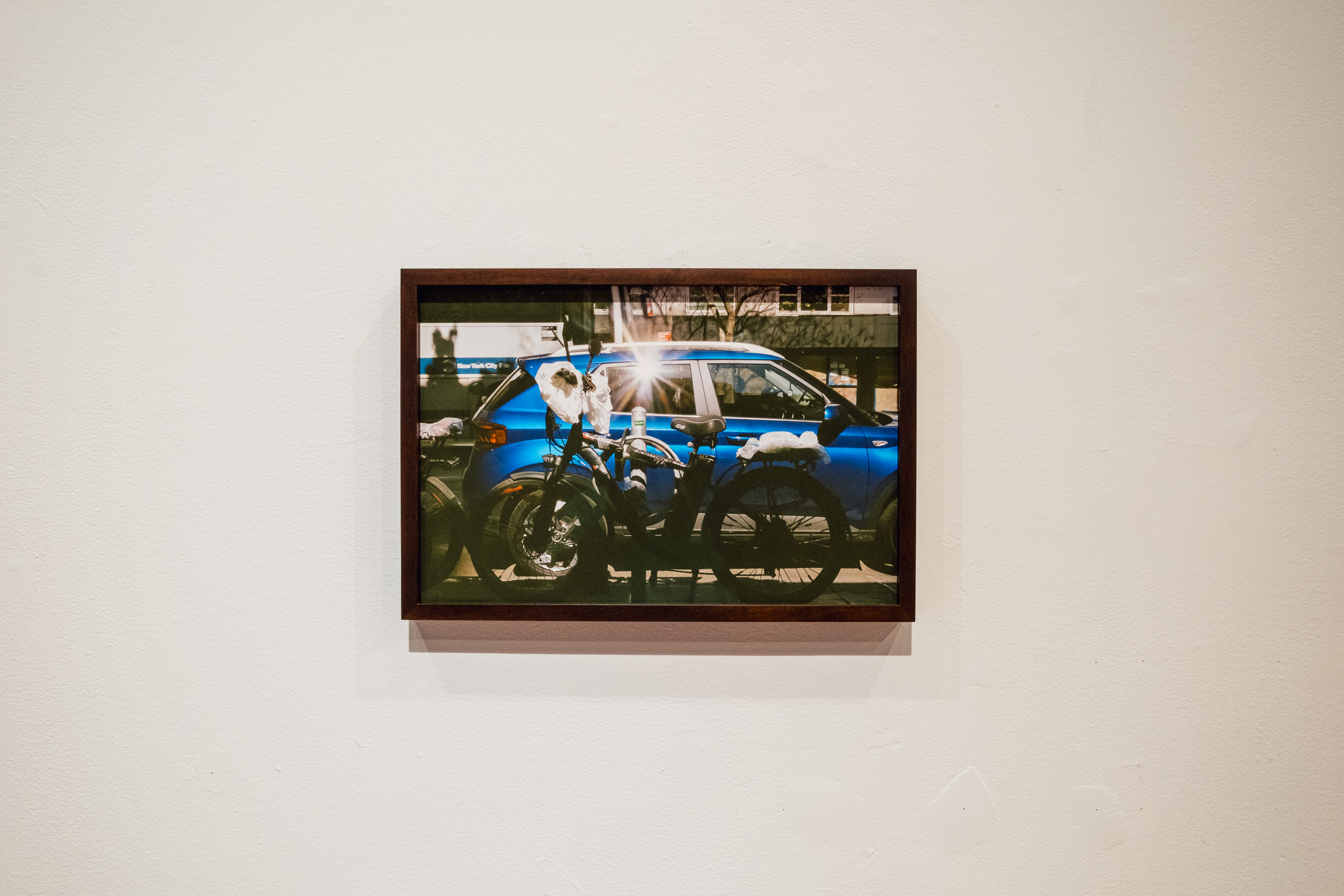 fields harrington presents photographs, a vinyl window decal, a sound piece, and a custom feather flag that draw attention to New York City’s delivery workers and the extractive labor systems that power their tools and time. In on peak, alert tones that drivers hear when new orders come in, create a disorienting sonic environment in the gallery that echoes the relentlessness of algorithmic management. It’s a digital metronome of modern exploitation and hunger. On the walls, and on one of the windows of the gallery, harrington's ongoing series of intimate photographs of e-bikes—absent their riders—offer ghostly portraits of labor’s apparatus.