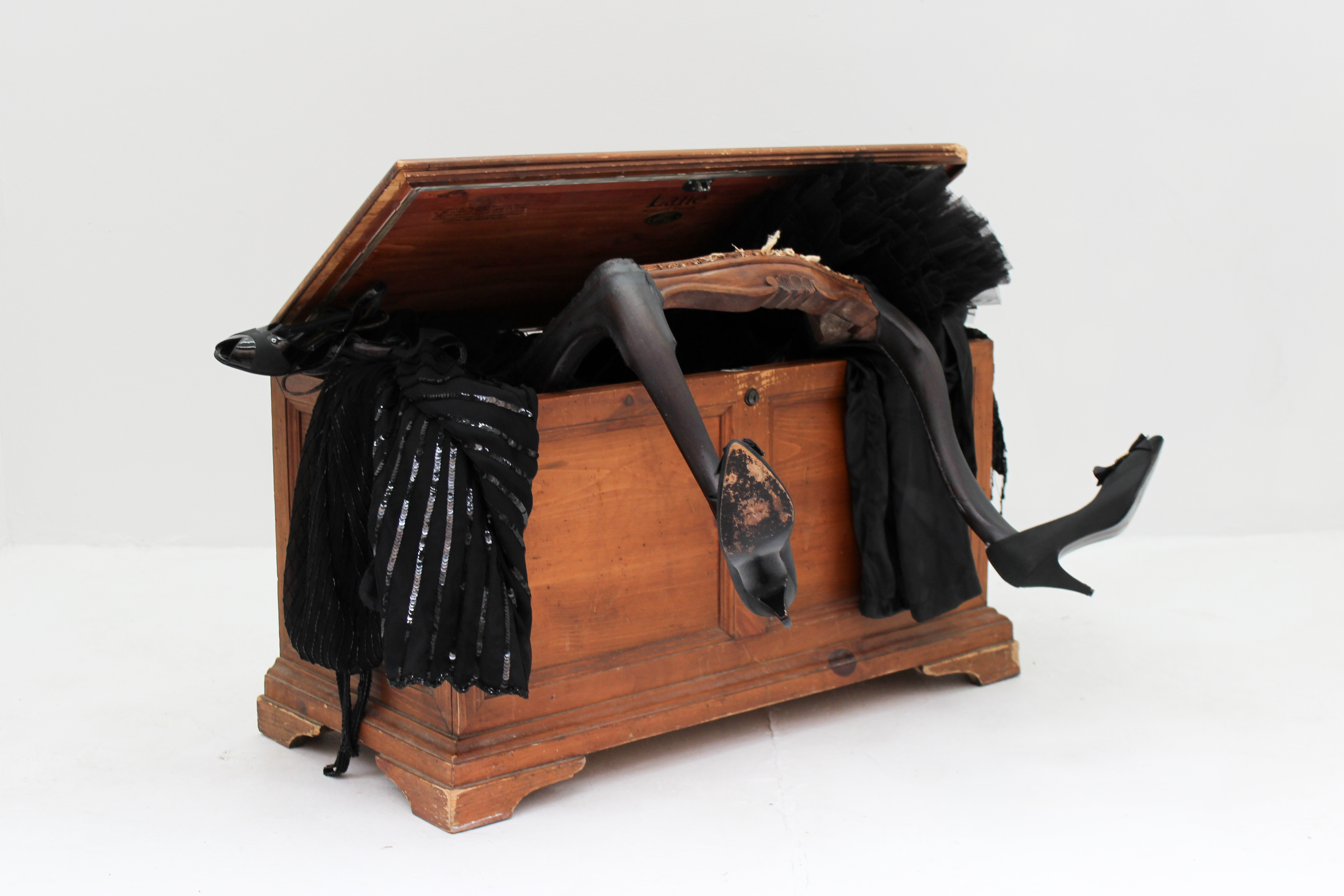 At Below Grand, you’ll see the scene of the crime: The dressing room’s chair split in two, avatars of the maid and Christopher. Around them, carnage. A velvet frame, exploded bouquets, a shredded uniform, a mirror shattered into gossip, and a boudoir drunk on its own collapse.